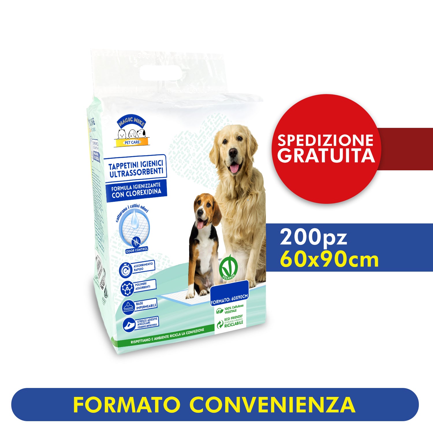 Avere un cucciolo a 4 zampe in casa è sicuramente una gioia, ma anche lui ha i suoi bisogni e, soprattutto i primi tempi, si rischia di trovare brutte sorprese. Grazie ai tappetini assorbenti per cani alla Clorexidina Magic Mike, tutto questo diventa semplice e pratico grazie a vari formati e le qualità assorbenti.