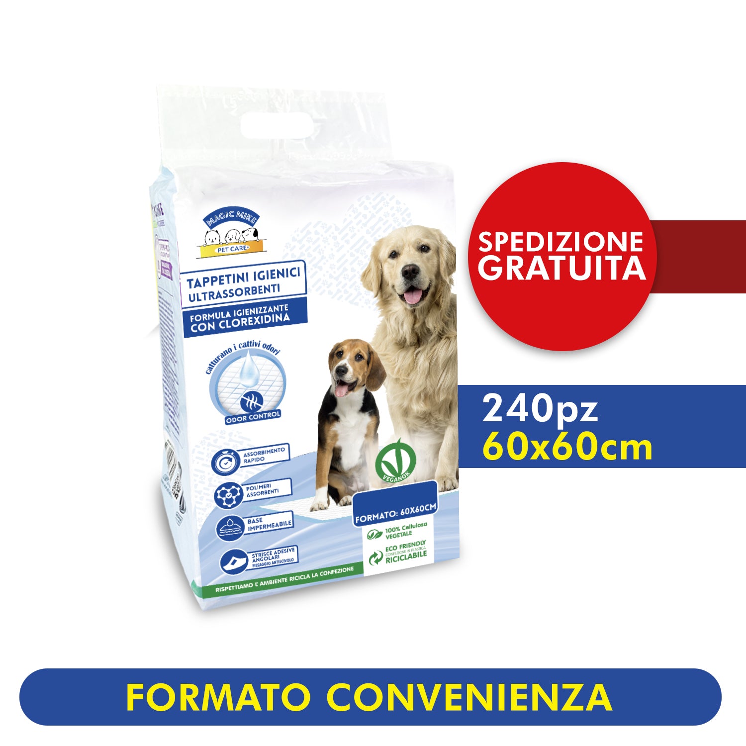 Avere un cucciolo a 4 zampe in casa è sicuramente una gioia, ma anche lui ha i suoi bisogni e, soprattutto i primi tempi, si rischia di trovare brutte sorprese. Grazie ai tappetini assorbenti per cani alla Clorexidina Magic Mike, tutto questo diventa semplice e pratico grazie a vari formati e le qualità assorbenti.