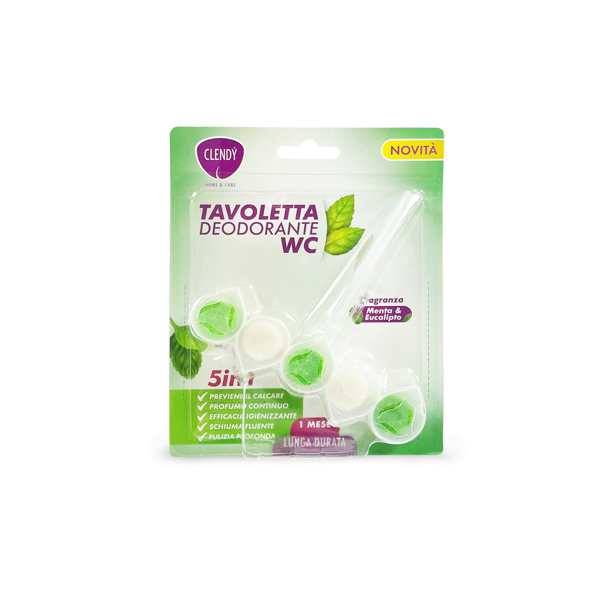 La Tavoletta Deodorante WC Clendy 5in1 è studiata per garantire un WC sempre fresco, pulito e igienizzato. Grazie alla sua formula avanzata, offre 5 azioni in 1, prevenendo il calcare e diffondendo un’intensa fragranza di menta ed eucalipto.