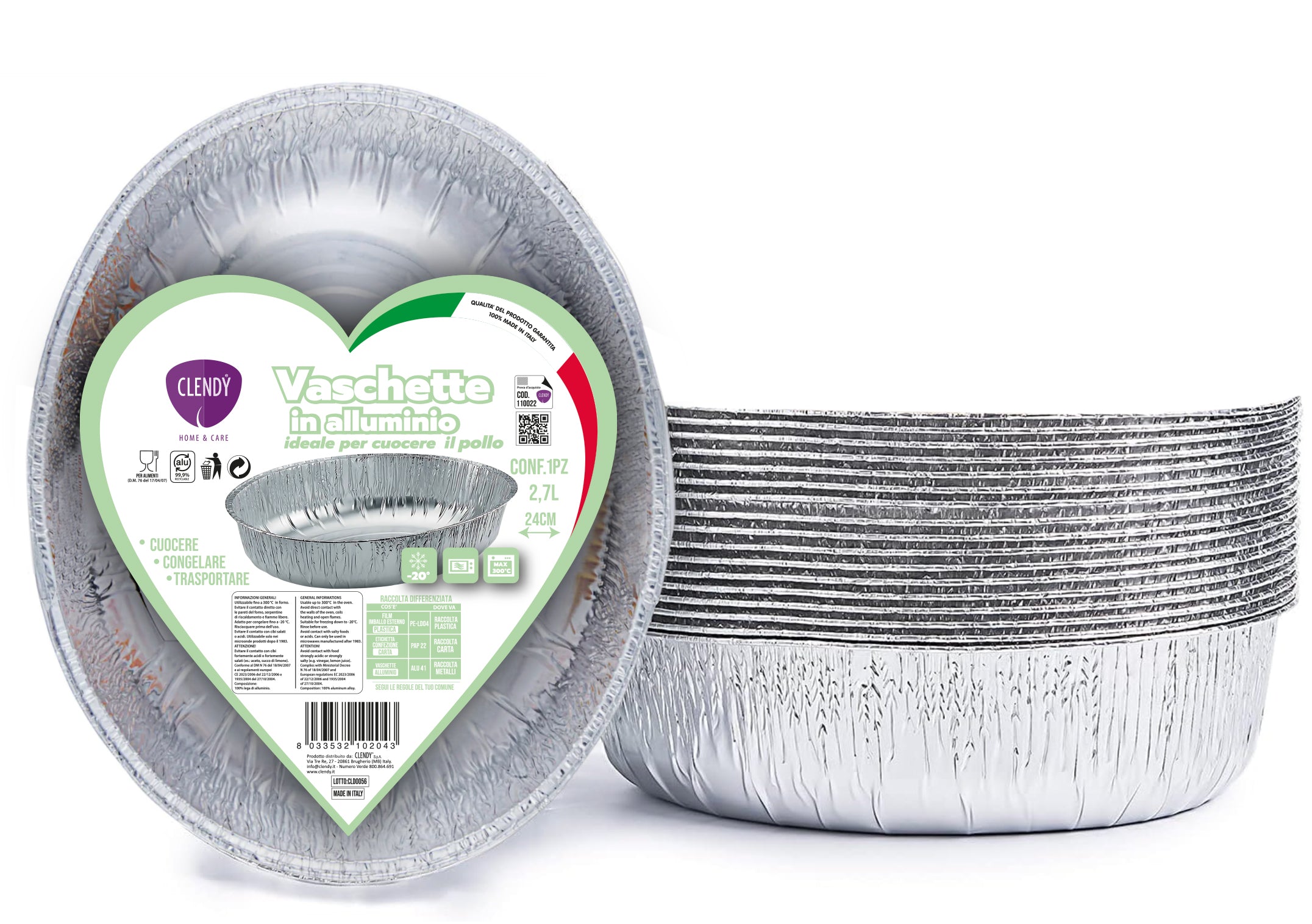 Le Vaschette in Alluminio Clendy sono ideali per cuocere, conservare e trasportare piatti a base di carne, arrosti e pollo. Assicurano una cottura uniforme e ottima resistenza.